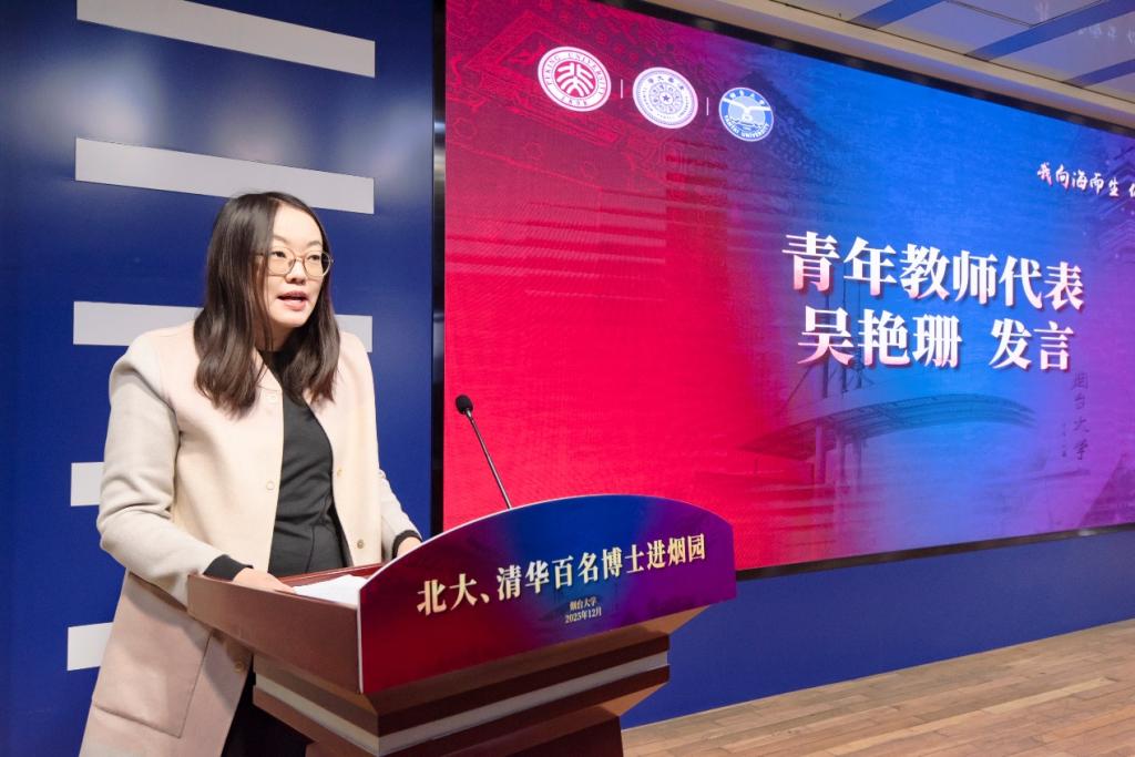 青年教师、清华大学2024届博士毕业生吴艳珊老师分享了从清华求学到来烟大任教的心路历程。她表示,从清华园到烟大校园,是文脉的接续,更是初心的回归,既是对两校援建情谊的传承接续,也是基于事业平台与城市潜力的理性抉择,期待学弟学妹选择烟大、扎根烟大,在这片热土上实现学术理想与人生价值。
