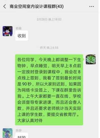 文件学院组织的信息化技能培训课程,去了解自己不太熟悉的直播课软件。另外也提前让学生做好学习的准备,先建立了课程的微信群,把所以学生都拉进群,通知他们课程学习方式,让他们准备好上课用的智能手机、平板、电脑等,并下载相关软件。经过一个周紧锣密鼓地准备,在开始直播之前进行了线上测试,确保每一个学生能够看。制定这些计划,确保线上教学顺利开展。