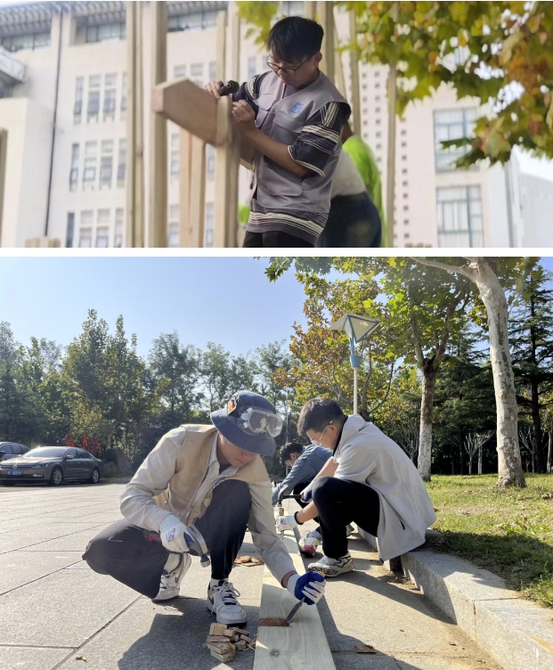 每组场地的大小地形不一,为了使建筑稳固站立,队员们进行了场地的调整。由于木材的加工程度不一,队员们要对木材进行深度加工,先用尺子和笔做标记,再用锯子和电钻进行切割和钻孔,随着树影的移动,搭建工作也在有条不紊的进行中。