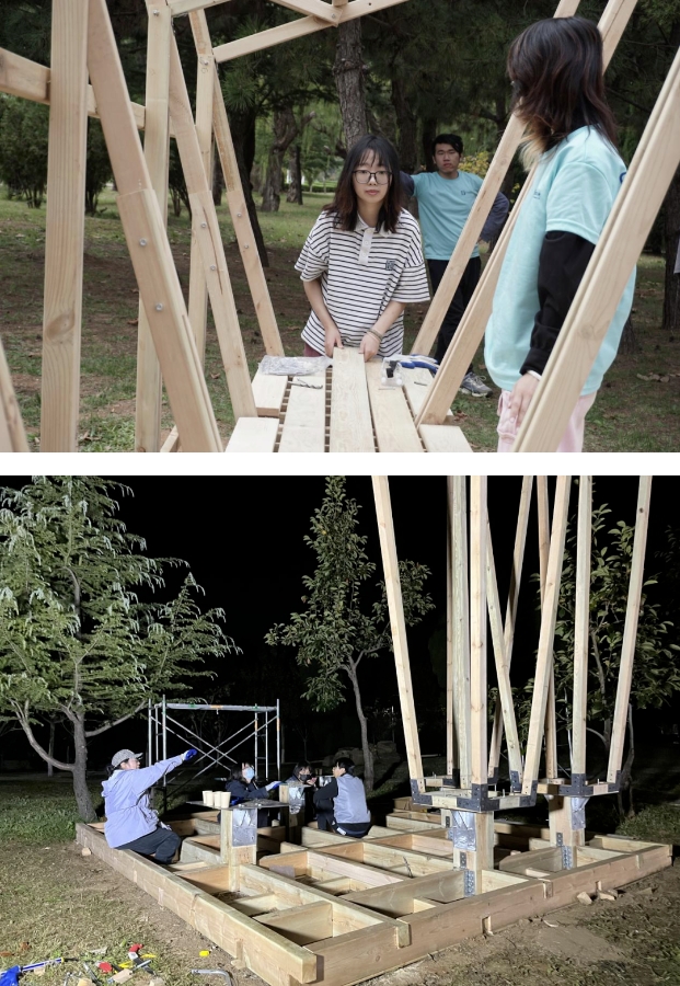 各参赛队伍开始投入实体搭建之中,首先是清点工具、核对木材,工具搬运到搭建场地后,指导老师进行搭建前指导,讨论过后各组进入正式搭建过程。
