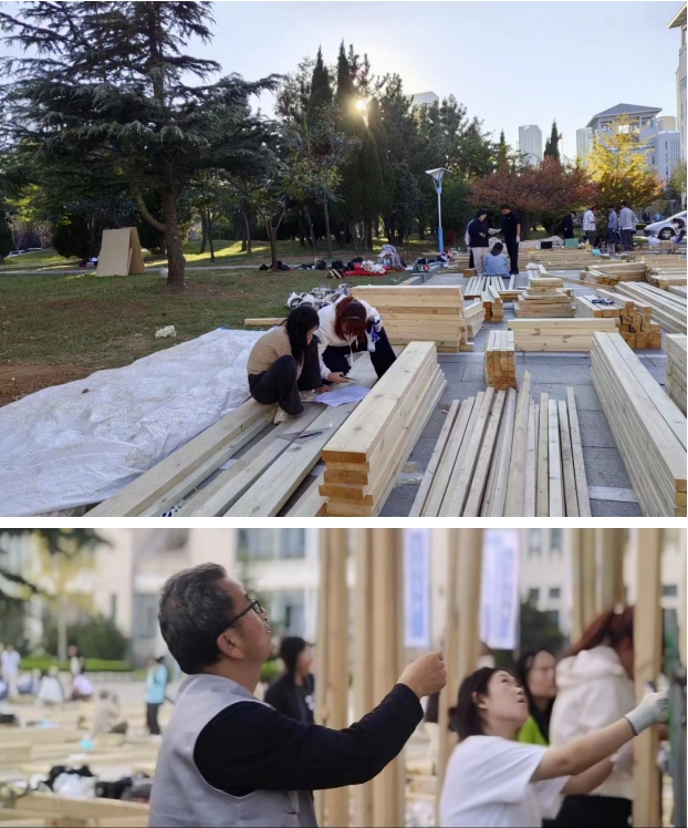搭建结束,天津大学yanetfix 副院长张昕楠教授,东方农道集团总经理、东方农道设计院创始人大股东王磊院长,烟台钰浩建筑工程有限公司王永军总经理,青岛理工大学建筑与城乡规划学院常务副院长解旭东教授,yanetfix 院长隋杰礼教授,山东大学土建与水利学院建筑学系主任宁荍教授作为评委入场,开始现场答辩和评委专家点评,最终评选出了搭建赛道四个一等奖作品---与校园的四次对话、郁林亭、四秩风华、归巢。