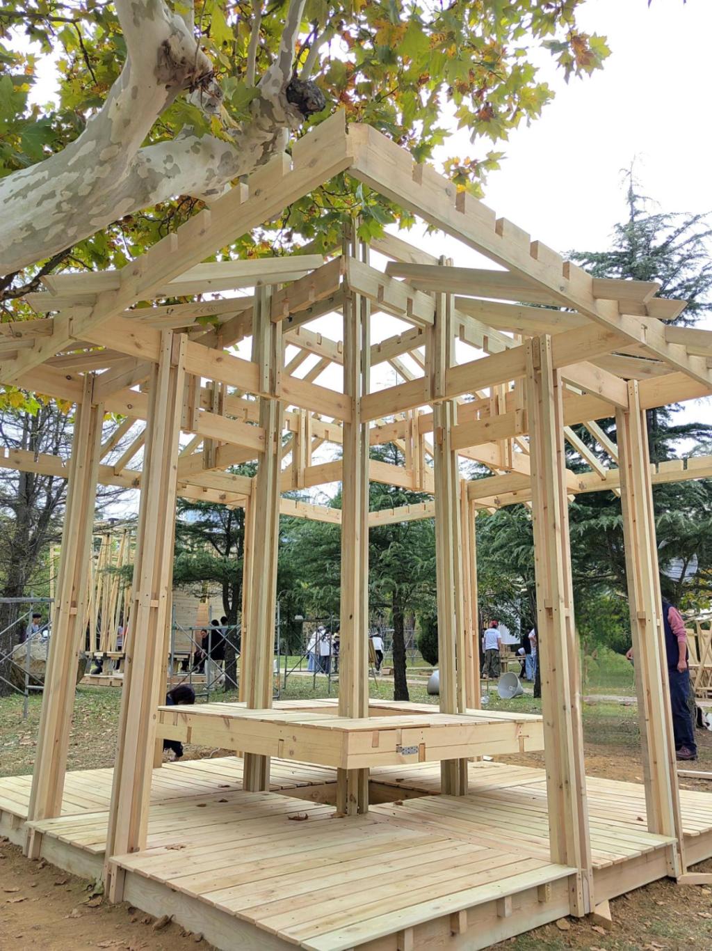 搭建工作主要是地基的搭建和木材的深度加工两部分,参赛队员用饱满的热情为搭建工作起了一个良好的开端,“良好的开端是成功的一半”,在搭建过程中,队员们协调配合,各组老师也从旁指导。搭建紧锣密鼓地进行着,让人期待4件作品的最终完成。