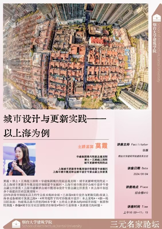 莫霞:博士,正高级工程师,华建集团现代院副总规划师、城市更新研究院院长,是上海城市更新青年规划设计师联盟专家顾问,上海市城市规划学会城市设计专委会副主任委员,上海市建筑学会城市规划与设计专委会副主任委员,在上海市各区多个街道担任社区规划师。近5年获得省部级及以上的专业技术奖20余项,已出版《城市设计与更新实践:探索上海卓越全球城市发展之路》、《冲突视野下的可持续城市设计:本土策略》,《新一轮旧区改造:构建高品质生活空间》3本专著,主持或主要参与约40项省部级、集团和院课题,参编《城市既有社区韧性评价标准》等6个行业标准,发表论文约50篇。